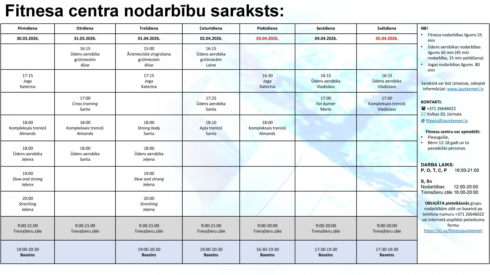 Uzmanību! Lai apmeklētu Fitnesa centra nodarbības, lūdzam aizpildīt pieteikšanās anketu internetā: https://ej.uz/fitnessjaunkemeri